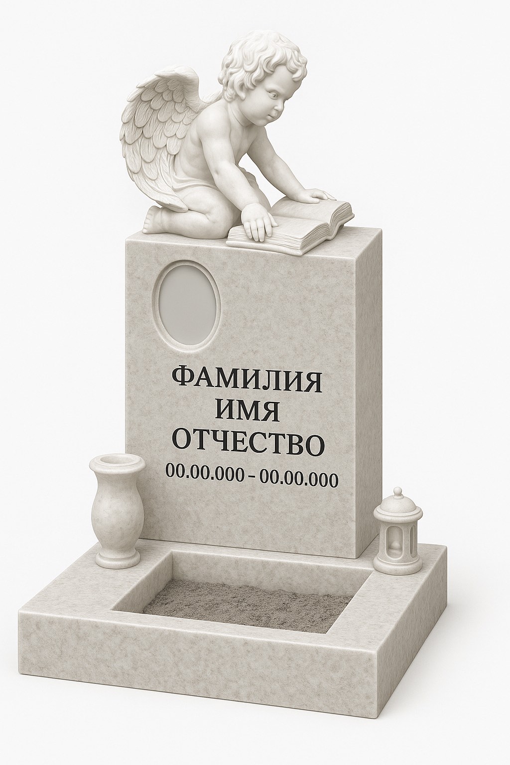Светлый и трогательный памятник, выполненный с особой заботой и вниманием к деталям. На стеле размещена авторская скульптура ангела с книгой, символизирующая чистоту, знание и небесную защиту.