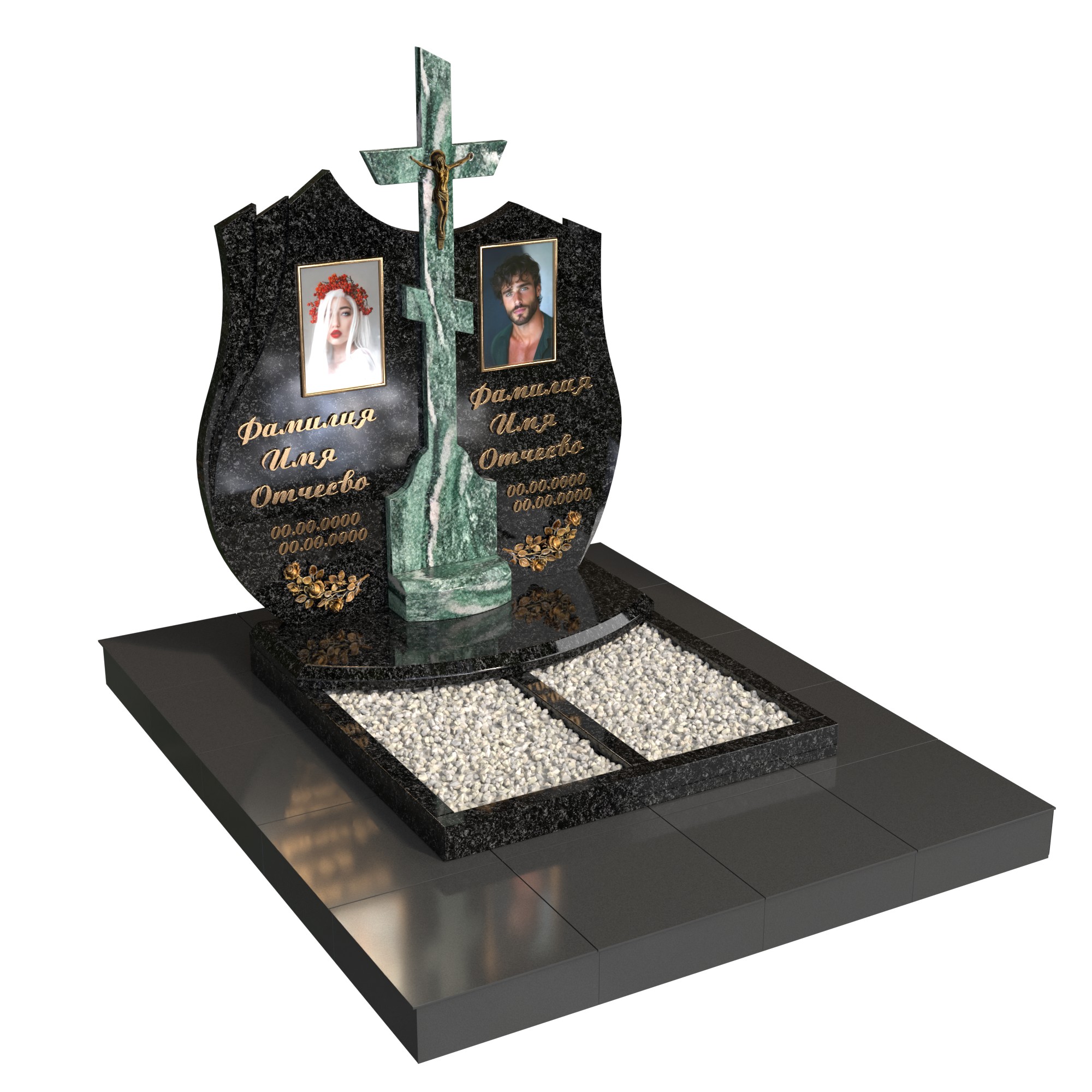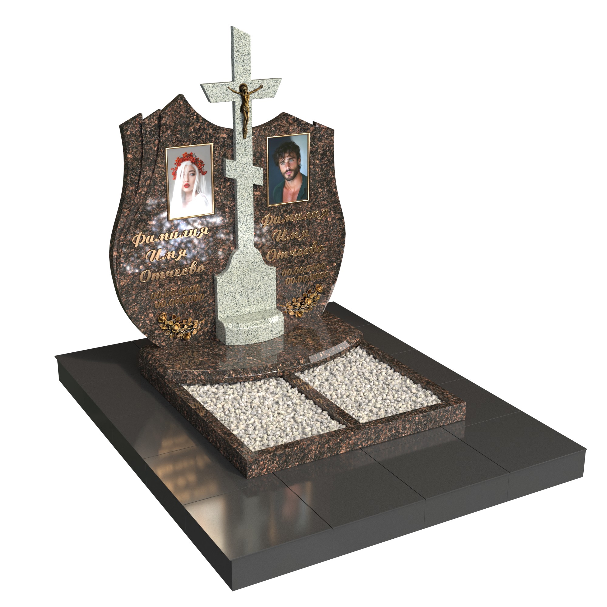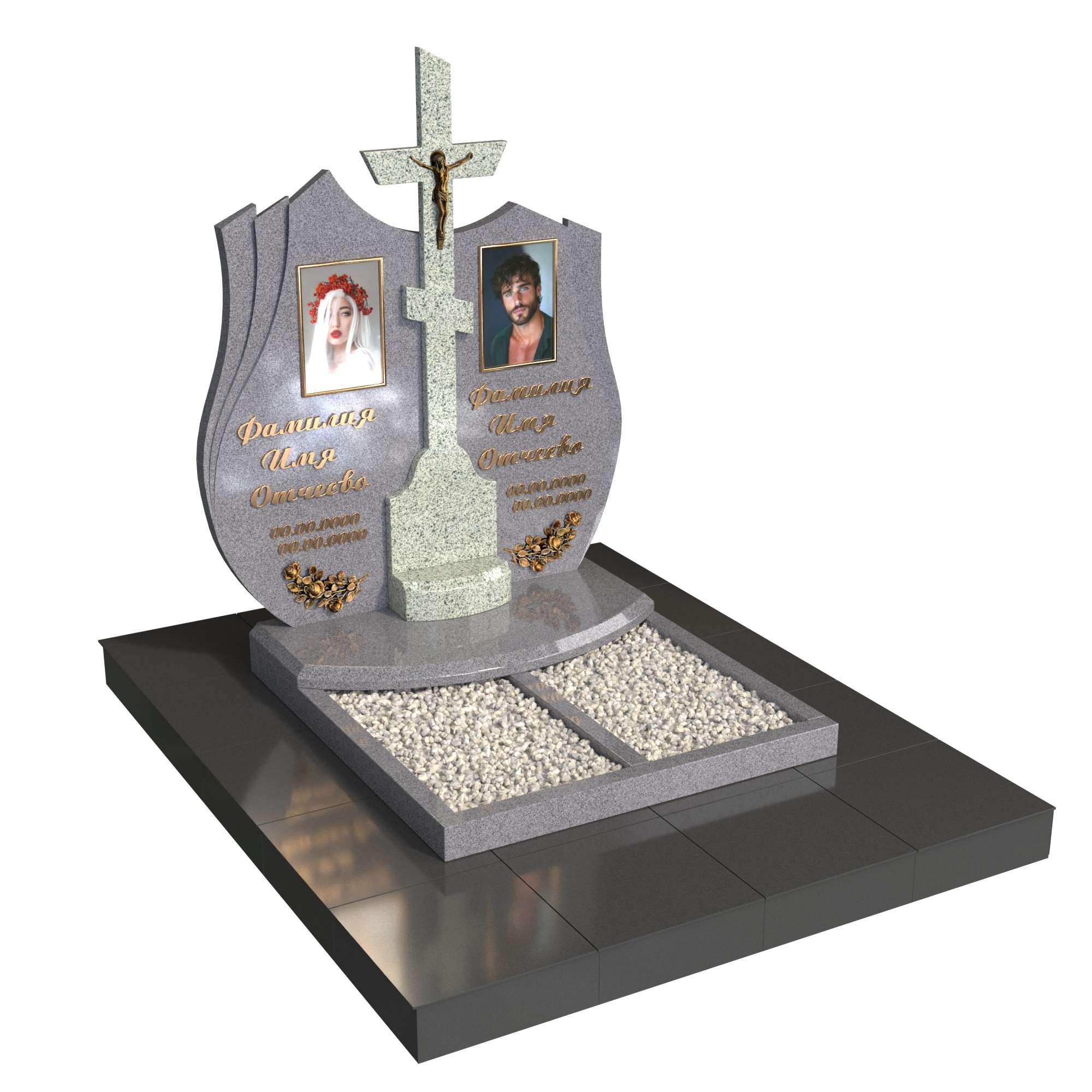 Парный памятник «Семейный щит» — торжественный семейный комплекс для двух захоронений. Две фигурные стелы в форме щитов объединены центральным каменным крестом, символизируя защиту и единство. В каждой стеле — фотопортрет на стекле и индивидуальная гравировка. Внизу — аккуратный двухсекционный цветник с мраморной крошкой; композицию дополняет изящный декоративный элемент и постамент.