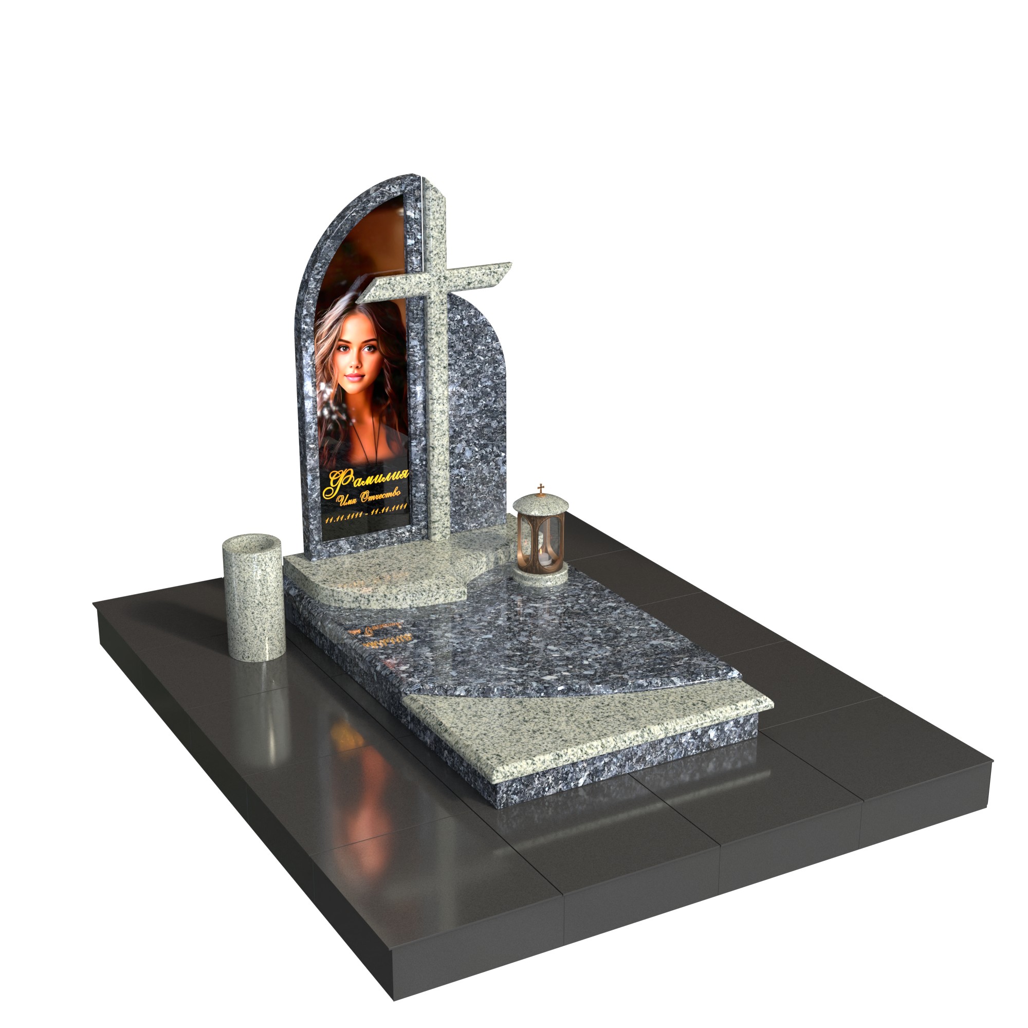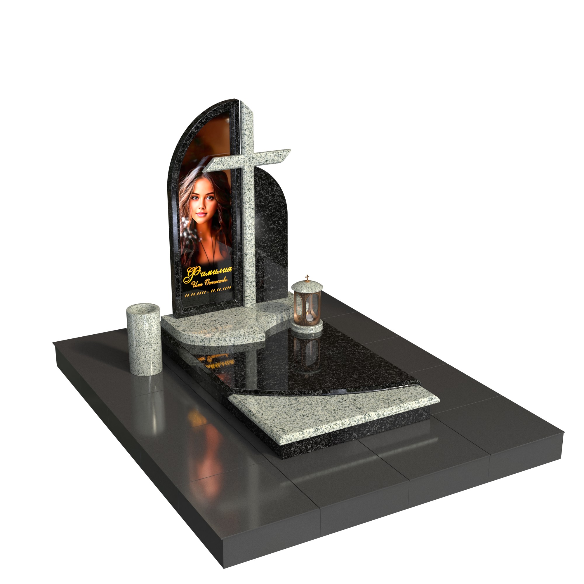 Памятник «Порог света» — современная асимметричная композиция из натурального камня. Изогнутая стела с аккуратной горизонтальной полкой образует изящный архитектурный силуэт и подчёркивает фотопортрет на стекле. Горизонтальная плита с контрастной вставкой, цилиндрическая ваза и лампада на подиуме создают цельный, ухоженный вид участка.
